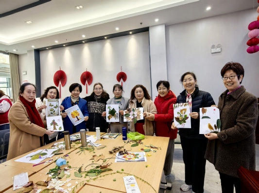 捡拾环节结束后,众人返回室内活动区,开展以落叶为主题的手工创作。在志愿者的引导下,居民们发挥想象、巧手拼贴,将一片片落叶转化为独具匠心的艺术画作,实现了落叶的“变废为宝”。现场气氛热烈融洽,大家互帮互助、交流创意,在合作中拉近了彼此距离。活动最后,大家展示作品、合影留念,为这场春日的绿色之约画上圆满句号。