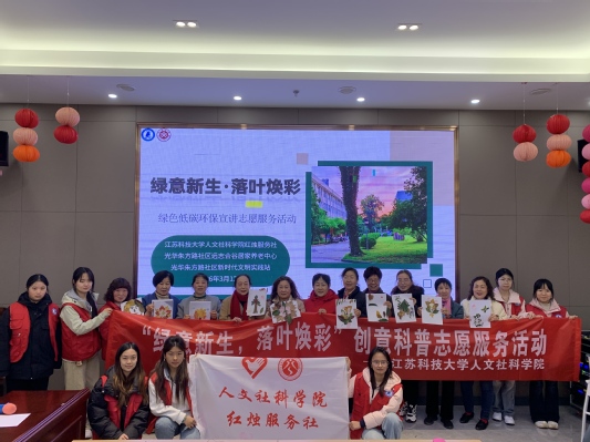 3月12日植树节当天,人文社科学院文轩“一站式”学生社区组织志愿者走进镇江市光华朱方路社区,共同开展了“绿意新生,落叶焕彩”环保科普主题活动。活动以“科普+实践”为主线,引导大家在俯身拾叶与巧手创作的过程中,共同践行环保责任,让绿色生态理念从认知走向行动,真正浸润到日常生活中。