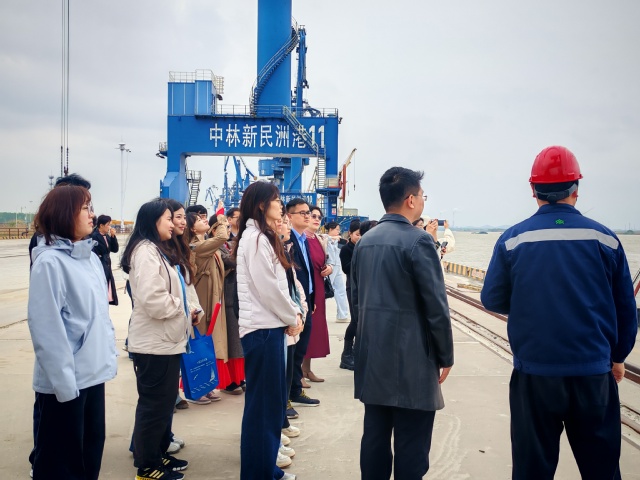 演出结束后,大家一同前往中林新民洲港,在工作人员讲解下,同学们详细了解了港口从无到有、由小到大的建设历程,以及作为长江经济带重要木材中转枢纽的战略定位。走在长江之畔,大家纷纷驻足远眺,对“港产城融合”的现代化发展有了更直观认识。